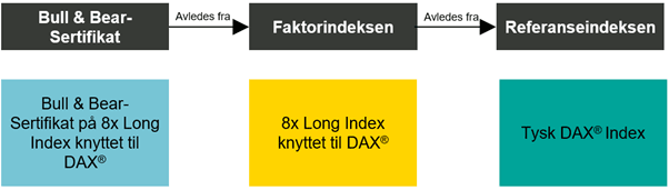 - Kjøp av et sertifikat (lang) med en faktor på fem på en faktorindeks som refererer til DAX® med et initielt DAX®-prisnivå på EUR 100,00