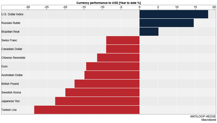 Trots hög inflation i USA har den amerikanska dollarn stärkts både relativt tillgångar som guld, men även absolut relativt andra valutor, sedan början på året. Medan DXY stigit mer än 18 procent i år har de flesta andra länder varit stora förlorare. Men vilken effekt får egentligen en stark dollar för den globala ekonomin, och finns det någon gräns för när det kan bli skadligt på riktigt?