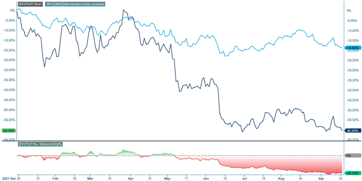 Utveckling (i %) för Bitcoins nuvarande rullande terminen och S&P 500, YTD i USD