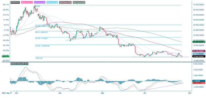Som framgår av diagrammet nedan handlas Bitcoin för närvarande på ett stöd. Intressant nog kan man se en positiv divergens mellan MACD och Bitcoin. Det ökar sannolikheten för att stödet ska hålla. En studs följt av ett brott över fallande MA100, och siktet är klart för ytterligare uppåt mot 30 000 USD-nivån.