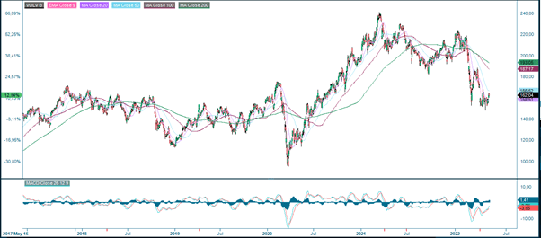 After falling to the SEK 160 level shortly after the outbreak of the Ukrainian war, Volvo shares made a rebound attempt to fall back towards the same level. Meanwhile, the stock has now held this bottom around the 160 SEK level for a little more than two months. So it looks like pretty strong support is forming here.