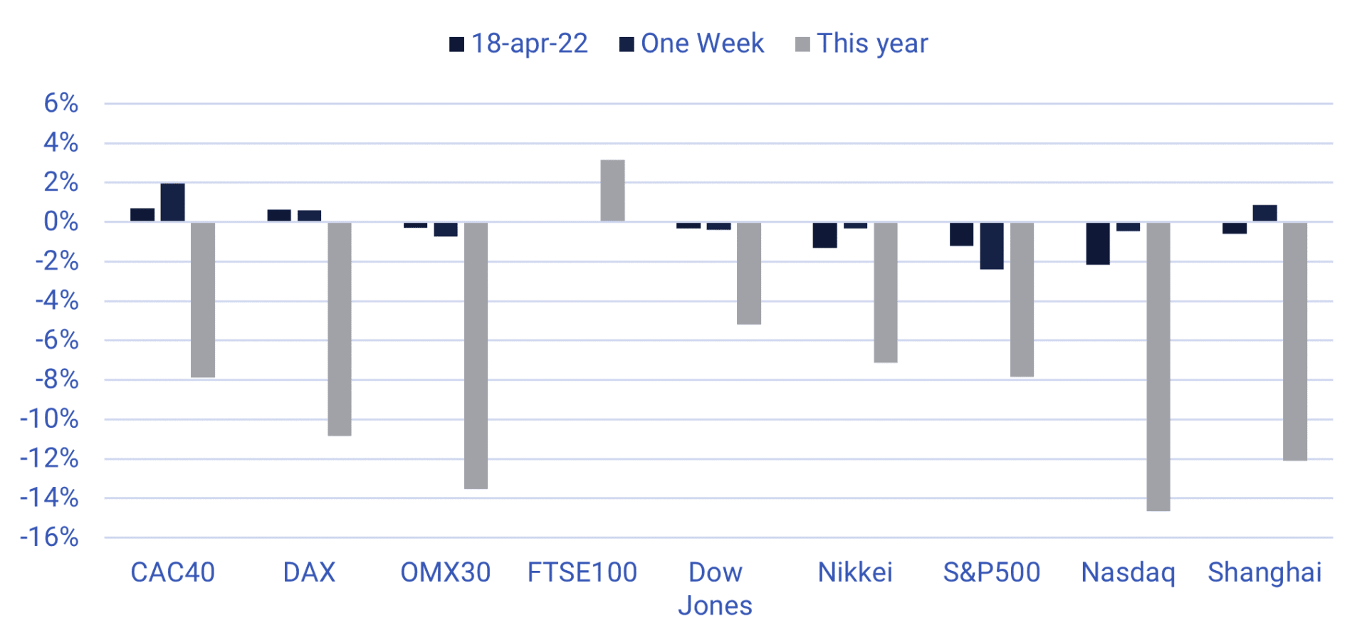 The past week has seen a minor share price decline, notably on the New York Stock Exchange, where the S&P500 index fell by 2.4 percent. Otherwise, changes have been small, and in Europe, Paris (CAC40) and Frankfurt (DAX) have risen slightly last week. The cyclical OMX30 in Stockholm is somewhat worse off, while the non-cyclical FTSE (London) index continues to be the best performer this year.