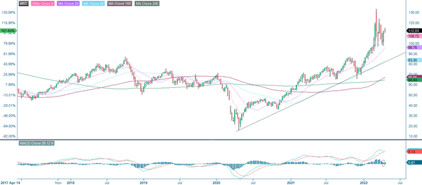 Brent oil has regained some strength after China seems to be looking to ease its restrictions, meaning increased activity and worries about supply in the wake of the Ukraine crisis. However, the daily chart below shows that the oil price is trading in a large bearish descending triangle that tends to break on the downside. Going for a short position may be considered very risky as momentum is picking up (see MACD). A more attractive timing will be when (and if) brent oil breaks the support level below the USD 100-level. In such a scenario, the target price given by the formation is around 70 USD/barrel.
