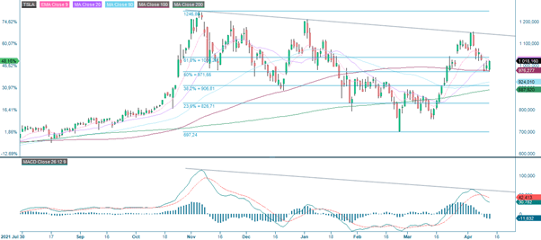 The Tesla share did not manage to break the falling trendline ahead of the report and is currently trading just above the psychologically important 1,000-level and strong support in the form of MA 100 and Fib 50. Perhaps a robust report and promising guidance can become the trigger needed for the share to break up.