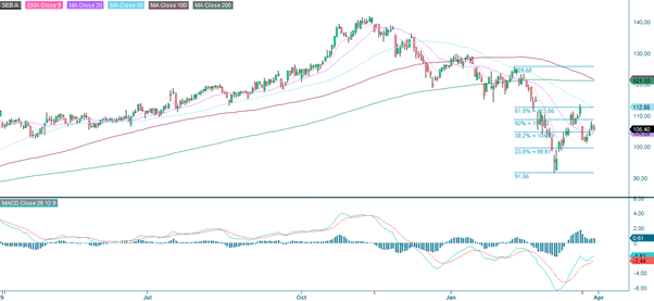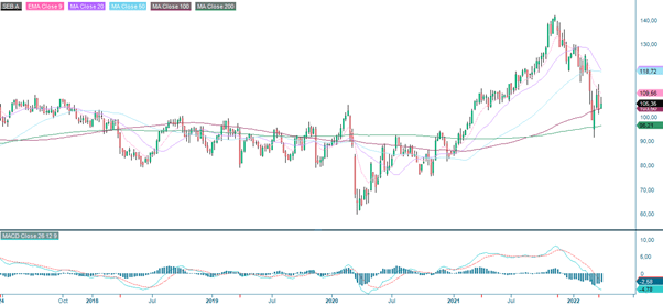 The SEB A share has moved above MA20and Fibonacci 38.2 levels and has positive short-term momentum. From a technical point of view, we see the potential for the shares to appreciate to slightly above SEK 112 (MA50 and Fibonacci 50 levels)