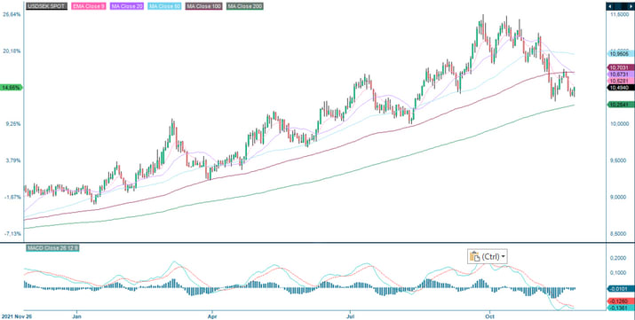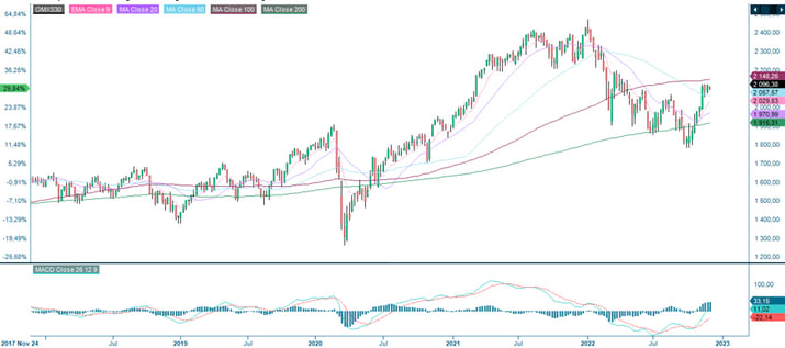 Investerarna verkar i allt högre grad tro på en recession 2023. Detta, i kombination med en försvagad USD, bör sätta press på OMX30 ur en fundamental synvinkel. Detta börsindex domineras av stora, börsnoterade företag vars intäkter till största delen kommer från exportmarknader i alla större geografiska regioner, inklusive Kina och övriga Asien.