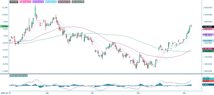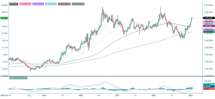 Guldet har återigen lyckats ta sig förbi motståndsnivån 1900 dollar, som nåddes mest tidigare under våren 2022. Den mycket svaga perioden från september till december 2022 gick emot den typiska säsongsmässighet som ses för guld, eftersom priserna tenderar att stiga i takt med den indiska bröllopssäsongen. Mest säkert dämpad av den hökaktiga Fed, marknadsosäkerhet och mildare ränteförväntningar bröt den negativa trenden. Förutom ovanstående kommer en annan typisk säsongsboom för guld i februari, nämligen Alla hjärtans dag. Även om främst chokladproducenter kanske ser fram emot denna dag har de amerikanska guldpriserna historiskt sett tenderat att få ett uppsving i takt med att försäljningen av smycken ökar. Eftersom den kommande detaljhandelsrapporten från det amerikanska handelsdepartementet väntas visa hackiga uppgifter om konsumentutgifter är det också möjligt att smyckesförsäljningen kan uppleva en läppstiftseffekt. Med tanke på allt detta kan guldet vara redo att trycka sig förbi motståndsnivån 1920 dollar och förbli starkt fram till den historiskt sett vanliga brytningen i mars eller april.