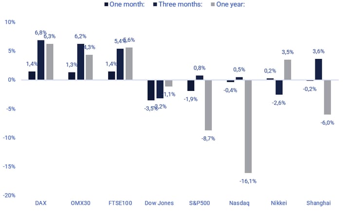 Betydande aktieindex utveckling under en månad, tre månader och ett år