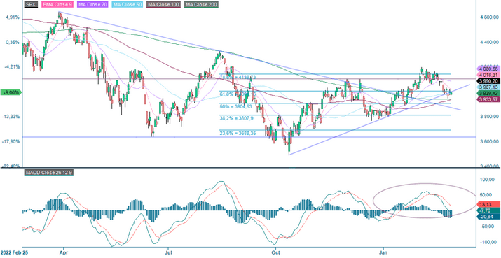 S&P 500 handlas vid ett kluster av stödnivåer i form av den stigande trendlinjen och MA200. Med tanke på bristen på riktning under de senaste handelsdagarna väntar marknaden på ny information för att hitta sin nästa riktning. MACD har genererat en säljsignal och risken är därmed fortfarande vinklad mot nedsidan. Ett brott under Fibonacci 50, strax över 3 900, och risken för nedåt ökar.