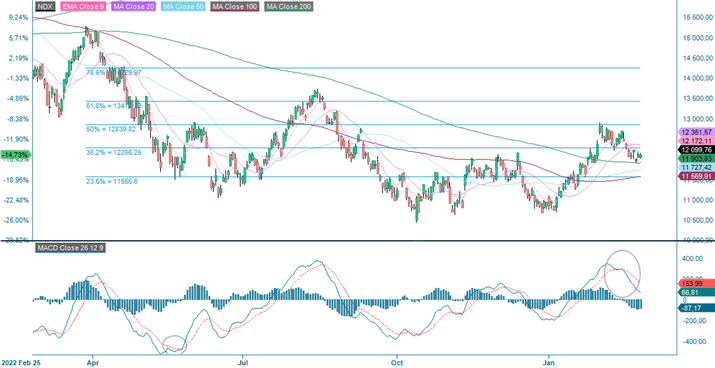 Trots den senaste tidens utveckling med stigande räntor har det tekniskt tunga Nasdaq 100 klarat sig ganska bra genom att handla sidledes. Det kan vara en indikation på att riskaptiten fortfarande finns där ute. MACD är en orosfaktor. MA200, som för närvarande ligger på 11 903, fungerar som stöd på nedsidan.