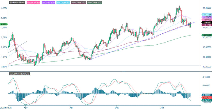 I USA överträffade den senaste inflationsmätningen förväntningarna. Kommer detta att vara fallet även för euroområdet? Ett sådant scenario kan ge styrka åt euron mot SEK. Valutaparet EUR/SEK handlas för närvarande vid stöd som utgörs av den stigande trendlinjen och MA100. Ett brott över MA20 ligger för närvarande vid 11,17. Den tidigare toppen från början av februari kan vara nästa steg. Vid ett brott på nedsidan utgörs nästa stödnivå av MA200, för närvarande vid 10,83.