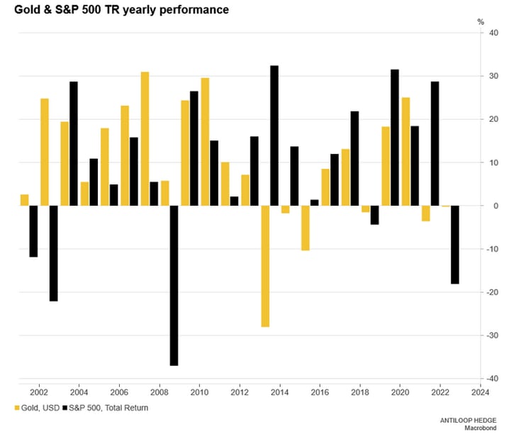 Guld och aktier har sällan dåliga år samtidigt, vilket gör att guld blir ett bra komplement till aktier.