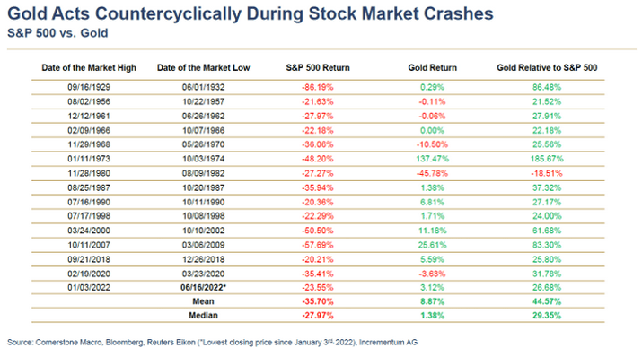 Historiskt under större och längre börsnedgångar har guld dessutom både i relativa (med ett undantag) och absoluta termer fungerat mot ett skydd vid nedgångar. Under 1970-talet till exempel, som präglades av hög inflation i ett helt decennium, så steg guldet mellan 11 januari 1973 till den 3 oktober 1974 över 137 procent och relativt S&P 500 över 185 procent. Under finanskrisen 2007-2009 steg guld i USD över 25 procent och relativt aktier 83 procent.