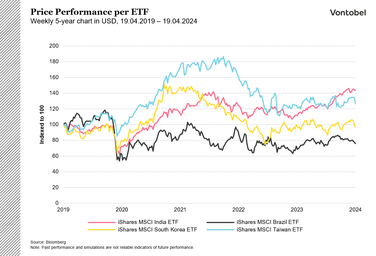 Vi har nyligen lanserat Mini Futures som följer ETFer med MSCI Indien, Sydkorea, Brasilien och Taiwan som underliggande index. Med våra produkter är det möjligt att oproportionerligt delta i både upp- och nedgångar i ETFerna. Här kan du lära dig mer om hur Mini Futures fungerar.