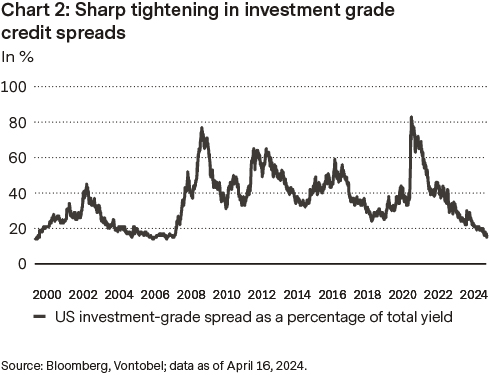 Optionsjusterade spreadar mot amerikanska statsobligationer, som speglar skillnaden i avkastning mellan stats- och företagsobligationer, är ett vanligt mått på fallissemangsrisk. Den kraftiga minskningen av kreditspreadarna för investment grade-obligationer har avsevärt minskat säkerhetsmarginalen för krediter. Spreadarna utgör nu mindre än 20 procent av den totala avkastningen på Bloomberg US Corporate Bond Index (se diagram 2).