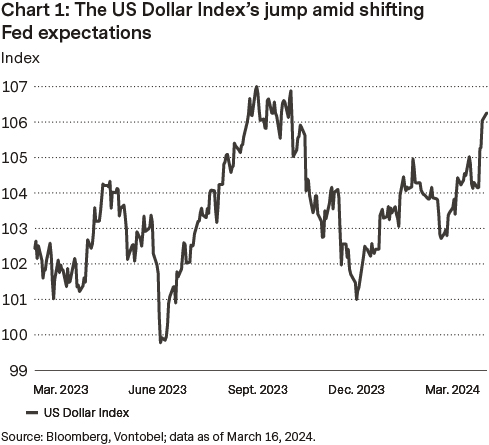 US-dollarbjörnarna har upplevt en frustrerande start på 2024. Hittills i år har US Dollar Index stigit med cirka 5 procent (se diagram 1), med stöd av marknadsförväntningar som har skiftat från att Fed förväntar sig upp till sju räntesänkningar för 2024 till färre än två. En ny omgång av riskaversion filtreras också genom marknaderna, vilket förstärker US-dollarns framsteg.