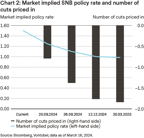 Även om en ny våg av geopolitiska spänningar gav visst stöd till schweizerfrancen är de underliggande fundamenta oförändrade: den schweiziska centralbanken (SNB) står inför en betydande duvaktig risk, vilket indikerar en potentiell ytterligare nedgång för francen. Trots svagare inflationsdata för konsumentpriserna i Schweiz fortsätter marknaderna att förvänta sig en begränsad sänkningscykel för SNB, med endast två ytterligare sänkningar inräknade för i år, vilket i slutändan skulle sänka styrräntan till 1 procent (se diagram 2). Den schweiziska inflationen visade en oväntad inbromsning, vilket förstärkte SNB:s beslut att sänka räntan förra månaden. SNB överraskade investerarna genom att sänka styrräntan förra månaden, vilket var den första åtgärden av sitt slag bland centralbankerna i G-10 sedan den globala inflationstoppen.