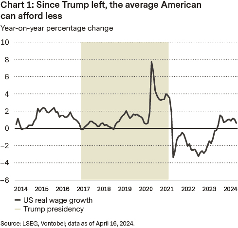 Samtidigt har förtroendet för statliga institutioner minskat i flera år. Enligt en Gallup-undersökning var förtroendet för Högsta domstolen strax under 60 procent på 1980-talet. År 2023 var det bara 27 procent. Endast förtroendet för tidningar (2023: 18 procent) eller kongressen (2023: 8 procent) ser sämre ut. Denna utveckling som pågått under lång tid har förvärrats efter Trumps avgång. En viktig orsak är sannolikt inflationschocken som gjorde att den reala (dvs. inflationsjusterade) lönetillväxten för många amerikaner blev negativ i början av 2021 (se diagram 1).