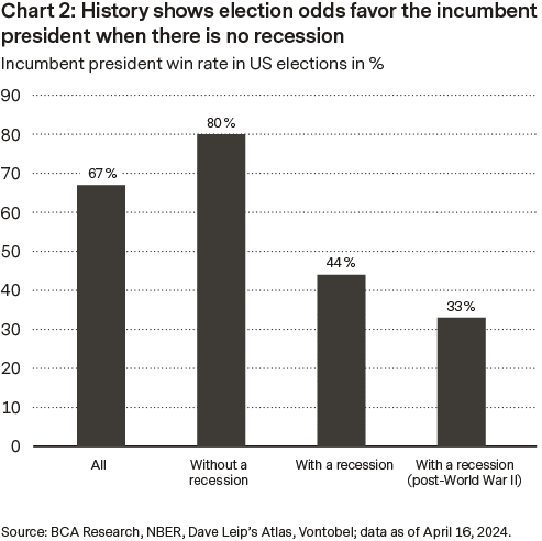 Statistiken är på Bidens sida. Historiskt sett har den sittande presidenten i USA blivit omvald i 67 procent av fallen. Om den sittande presidenten lyckas undvika en recession ökar den sannolikheten till 80 procent. Om ekonomin däremot går in i en recession straffas presidenten och sannolikheten sjunker till 44 procent (se diagram 2). Med tanke på den starka arbetsmarknaden, både i USA i stort men också i swing states, ser det i dagsläget ut som att en recession kan undvikas innan valet.