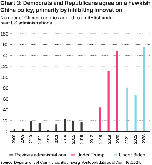Inställningen till världens näst största ekonomi kommer sannolikt inte heller att förändras nämnvärt. Både republikaner och demokrater har genom åren lärt sig att en Kina-fientlig politik ökar väljarstödet. Medan Trump är öppet fientlig mot Kina (som hans olika strafftullar som införts av Trump eller Trumps uttalande om att Covid-19 är ett "kinesiskt virus"), är Bidens strategi mer subtil men inte mindre bestämd. Detta blir till exempel tydligt när man tittar på de kinesiska företag som har placerats på USA:s "entitetslista" under de senaste åren (se diagram 3) .