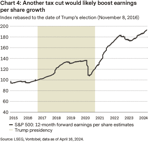 Om man ser till historien går aktiemarknaderna ofta sidledes inför val. Detta är knappast förvånande: valkampanjer åtföljs vanligtvis av osäkerhet om den framtida politiska kursen, och aktieplacerare gillar inte osäkerhet. När en vinnare väl har utsetts brukar marknaderna stiga - även om den sittande presidenten inte blir omvald. En ytterligare skattesänkning skulle sannolikt ha en positiv inverkan på vinsten per aktie (se diagram 4). Samtidigt bör investerare vara beredda på högre volatilitet på aktiemarknaden (i likhet med 2019), på grund av den mer oförutsägbara politiken. Inom tillgångsklassen är det aktier på utvecklade marknader som kommer att gynnas mest. Det kan finnas motvind för vissa aktier på tillväxtmarknaderna på grund av handelskriget.