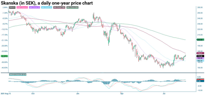 Skanska’s shares rose sharply after the Q2 report on 21 July, which was better than expected. This was particularly true for the US business and the order intake at the group level, which is a leading indicator for future revenues and earnings. Since then, the Skanska share has moved relatively sideways around the same level of about SEK 173 that was last reached on June 3, where yesterday’s last quote was SEK 171. If the current trend of rebounding interest rates and input price levels continues, Skanska shares could be able to recover further.