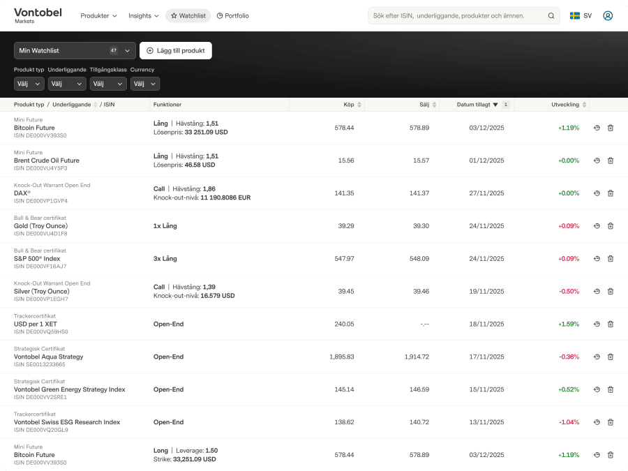 Har du redan ett konto?Logga inellerSkapa kontoTitleMrMrsFörnamnEfternamnE-postadressLösenordJag har läst och godkäntVillkor för användningSkapa kontoSkapa och hantera din bevakningslista för strukturerade produkter1 / 0