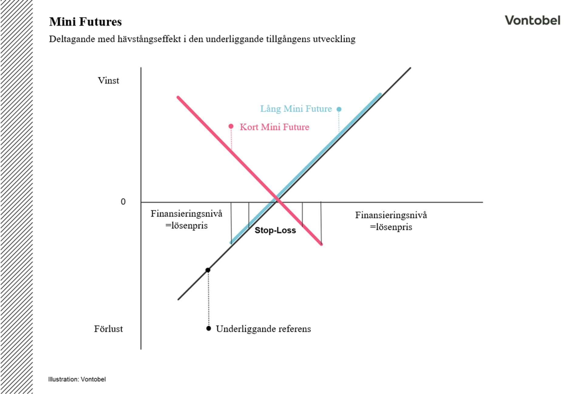Mini Futures hävstångseffekt gör det möjligt att delta oproportionerligt mycket i utvecklingen av en underliggande instrumentet. Jämfört med en direktinvestering i ett underliggande instrument kräver en investering i en Mini Future ett lägre kapital investerat. Hävstångseffekten beror på att investeraren endast betalar en bråkdel av priset på det underliggande instrumentet, medan emittenten finansierar den resterande delen.