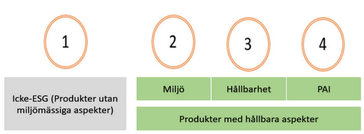 Vår klassificering av produkter med hållbarhetsaspekter är baserad på industristandarder och ser ut påföljande sätt: